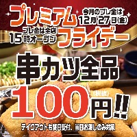 本年最後のプレミアムフライデー! 12月27日(金)のプレミアムフライデーは一部地域を除く店舗で15時OPEN×串カツほぼ全品100円(税抜)を実施致します。 ~月末金曜、何しよう? 串...