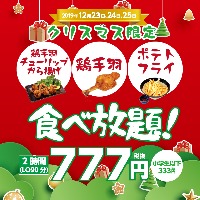 串カツ田中のクリスマス企画! 2019年12月23日(月)~12月25日(水)の3日間鶏手羽チューリップから揚げ・鶏手羽串・ポテトフライ 2時間食べ放題777円キャンペーンを実施いたします。