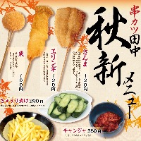 ~串カツのシーズン到来~ 2019年秋の新メニューを9月4日(水)から全国で販売開始します。 株式会社串カツ田中ホールディングス(本社:東京都品川区東五反田、代表取締役社長:貫 啓二...