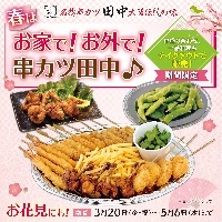 4月4日(土)~4月12日(日)までの休業期間、直営店舗におきましてはこちらの施策は休止しております。 〈春のテイクアウト企画〉 期間限定で串盛合せセット・一品メニューを...