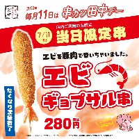 毎月11日は「串カツ田中デー」7月はエビを豚肉で巻いた「エビギョプサル串」!! ~エビを豚肉で巻いちゃいました~