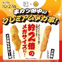 お値段そのままなのにメガサイズ!?大好評のメガ串が復カツ!!メガ鶏ももカレー味&メガ豚が単日限定で登場! ~プレ金は田中へGO!~