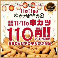 11月11日は“串カツ田中の日” 単日限定で260円以下の串カツ40品が110円に!! ~年に一度の特別な日~
