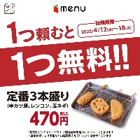 デリバリーがお得!4月12日(水)~19日(火)は menuで「定番3本盛り」を1つ頼むと、もう1つ無料でプレゼント!